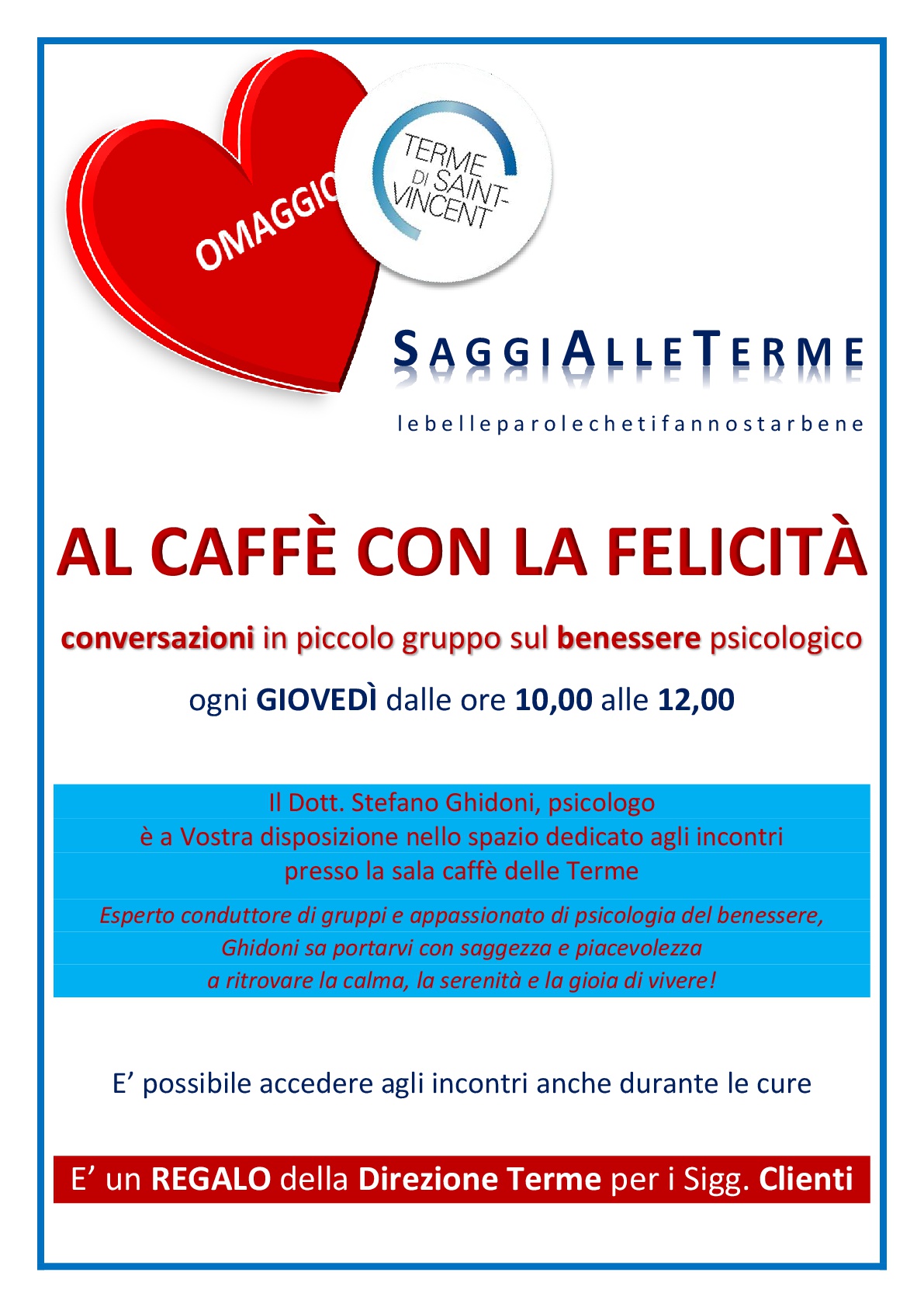 Il Poliambulatorio delle Terme di SAINT- VINCENT ha come obiettivo quello di porre al centro della propria attività l’esigenza del paziente, il suo stato di salute, con l’attenzione umana e la competenza professionale, nel rispetto della dignità e della privacy, necessaria a soddisfare ogni bisogno di diagnosi e cura, attraverso un’equipe sempre volta all’analisi dei risultati e a perseguire il miglioramento della qualità, attraverso l’applicazione condivisa di principi etici.